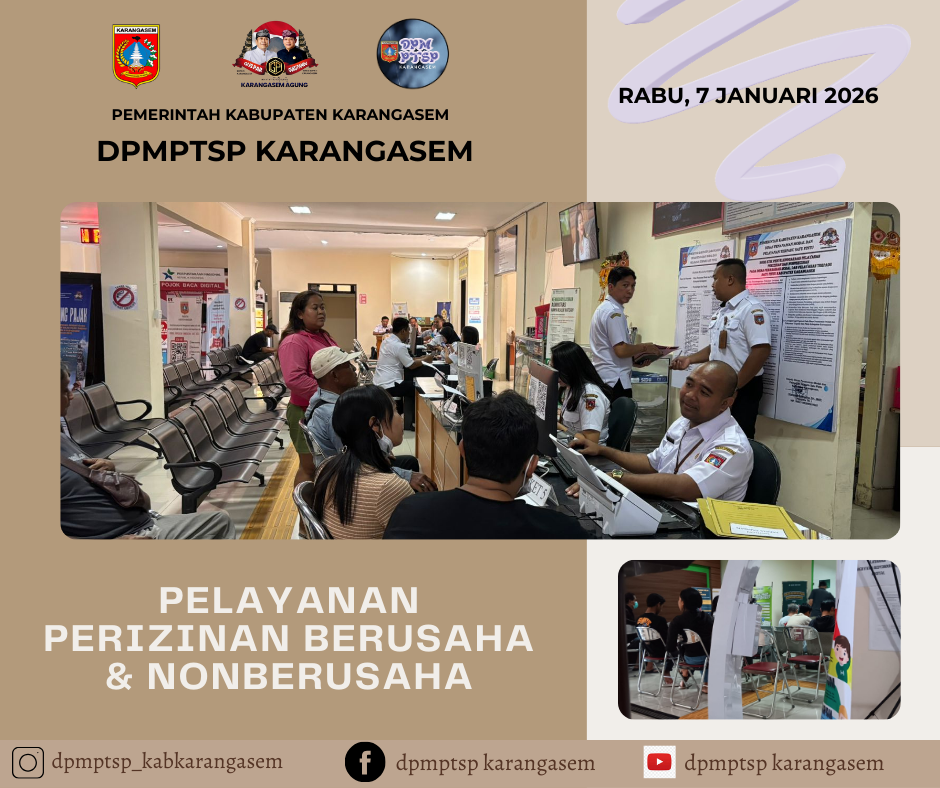 Jumat, 18 Nopember 2022 Kegiatan pelayanan perizinan dan nonperizinan di loket DPMPTS pada MPP Karangasem pada hari ini sebagai berikut : - Melayani Penambahan KBLI 1 orang - Melayani Perubahan Data 1 orang - Melayani Migrasi Data 1 orang - Perubahan Nama Koperasi 1 orang - Melayani Pendaftaran Surat Keterangan Penelitian 1 orang Secara keseluruhan, jumlah pengunjung di MPP berjumlah 92 orang.