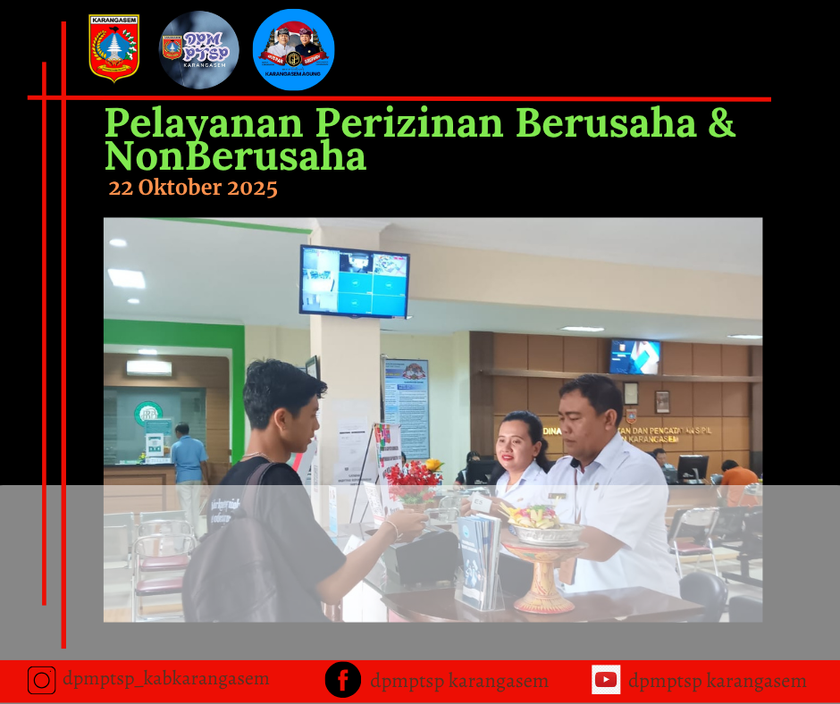 Rabu, 18 Oktober 2023 Pelayanan Perizinan dan NonPerizinan pada loket DPMPTSP di Mal Pelayanan Publik Kabupaten Karangasem hari ini melayani pengembangan usaha UMK 1 orang, pendaftaran UMK 2 or [...] Baca Selengkapnya